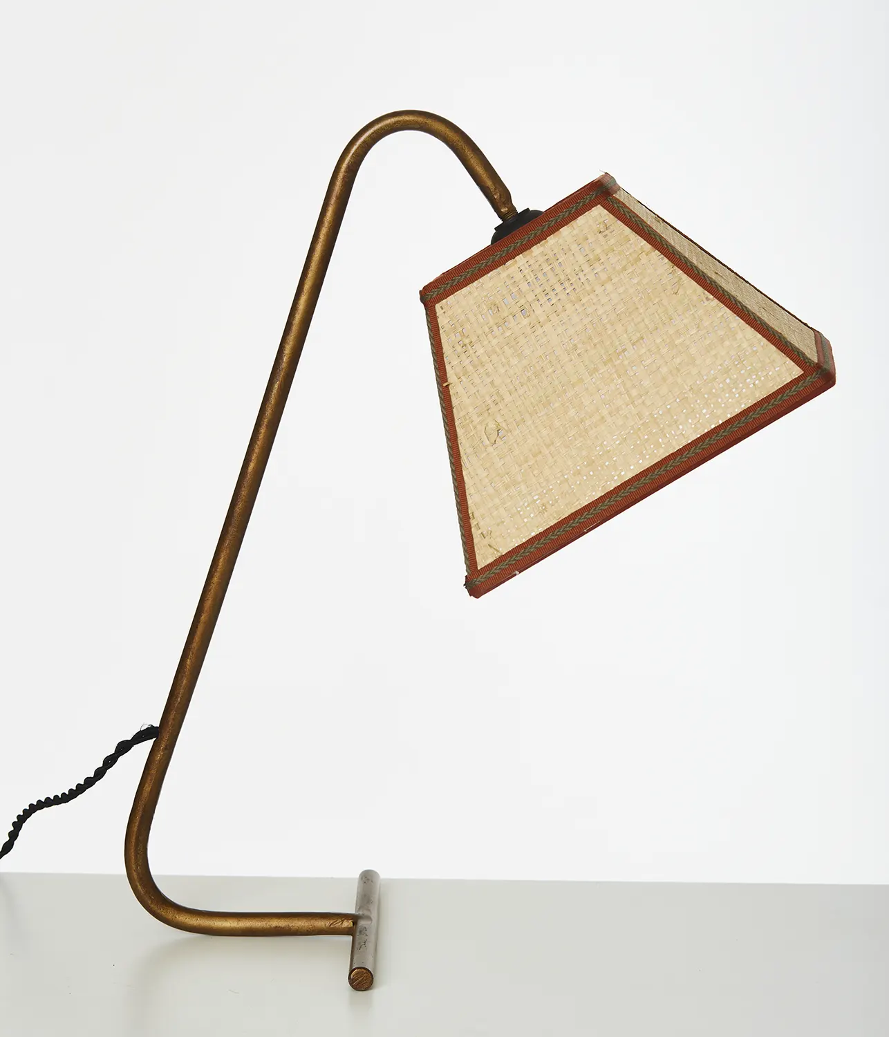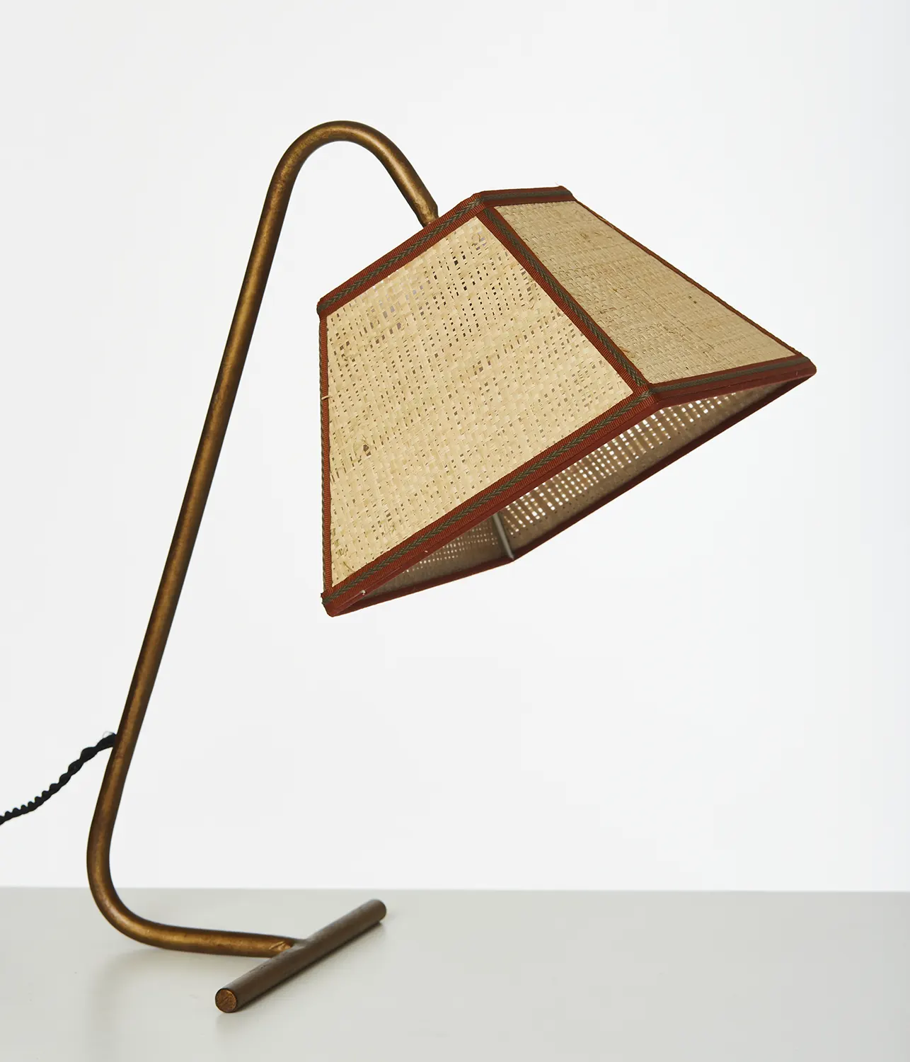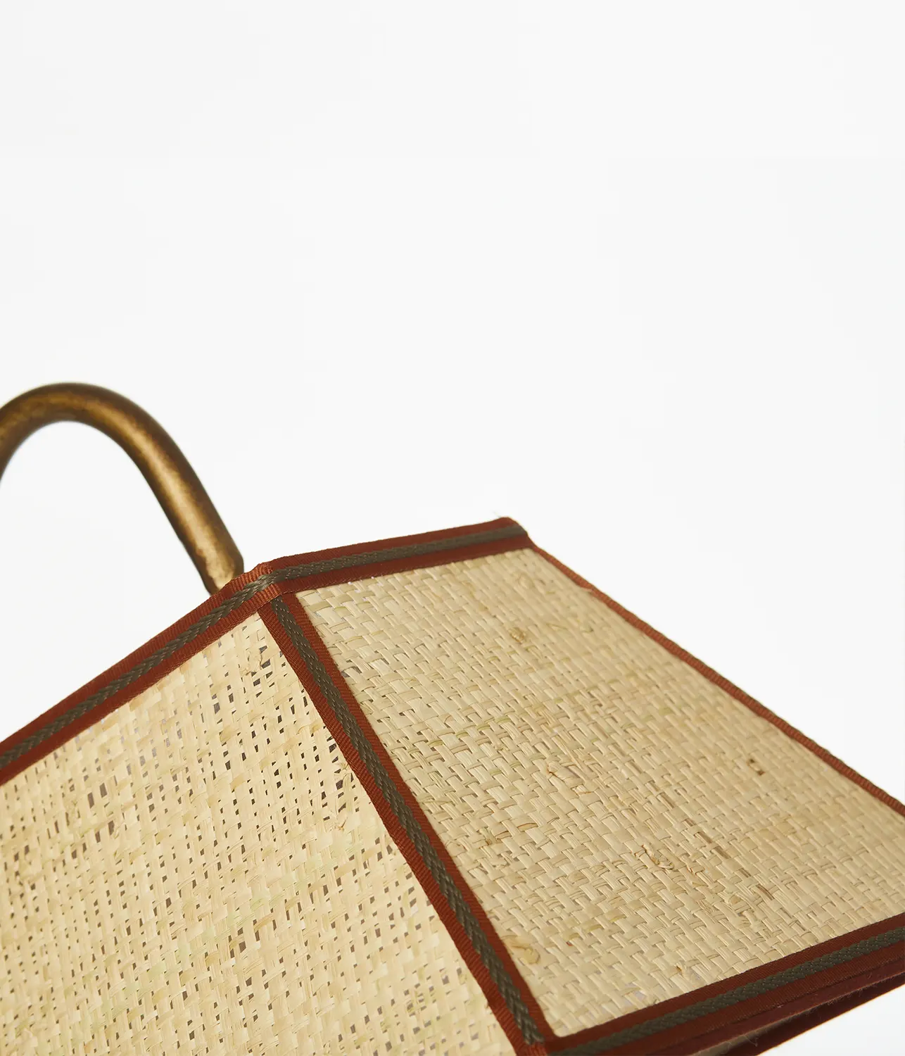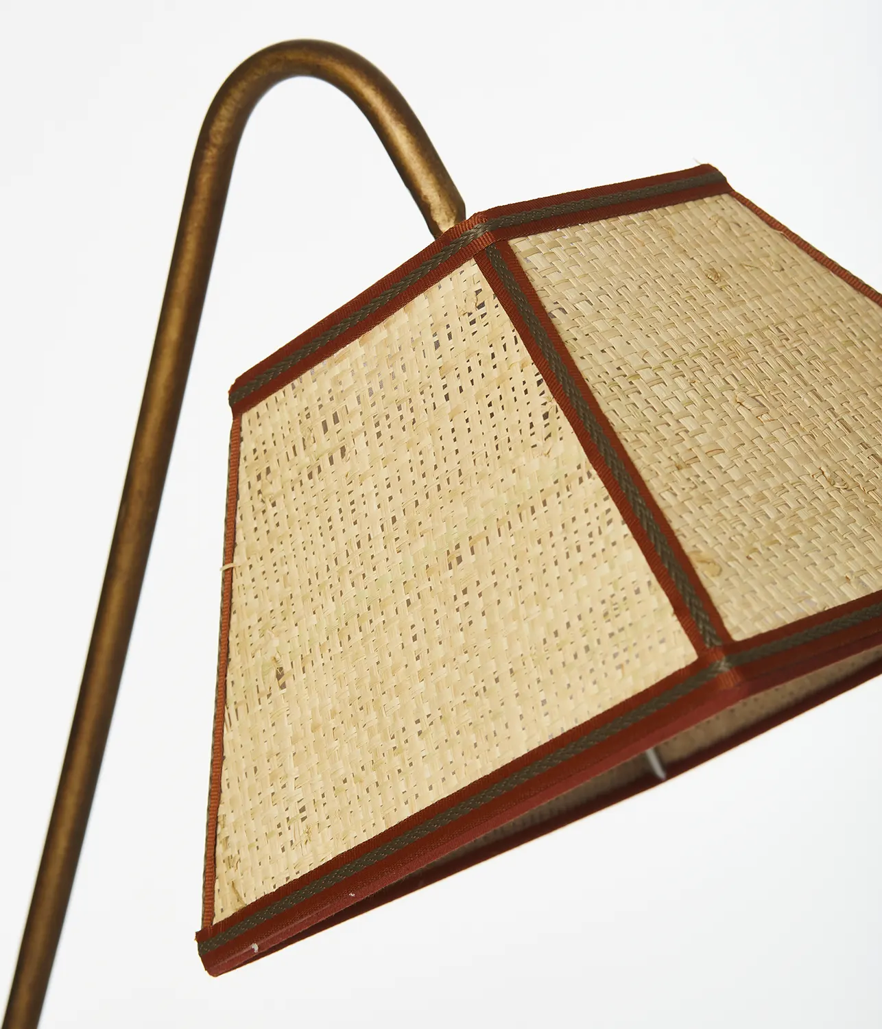 La acompaña una pantalla de 18 cm. De lado x 15 cm. De alto, realizada en rafia rematada con un bonito galón caldera y gris. Ideal para pequeños espacios con requieran luz directa.